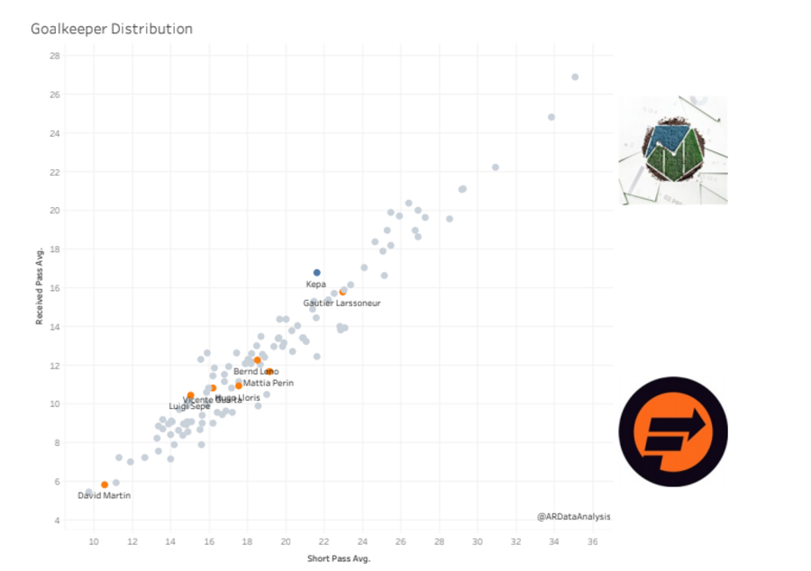 When we begin narrowing the database for ideal replacements, we want to find a goalkeeper who matches or exceeds Kepa’s distribution output, which can be summarised as an above-average workload focused on the short passing game.