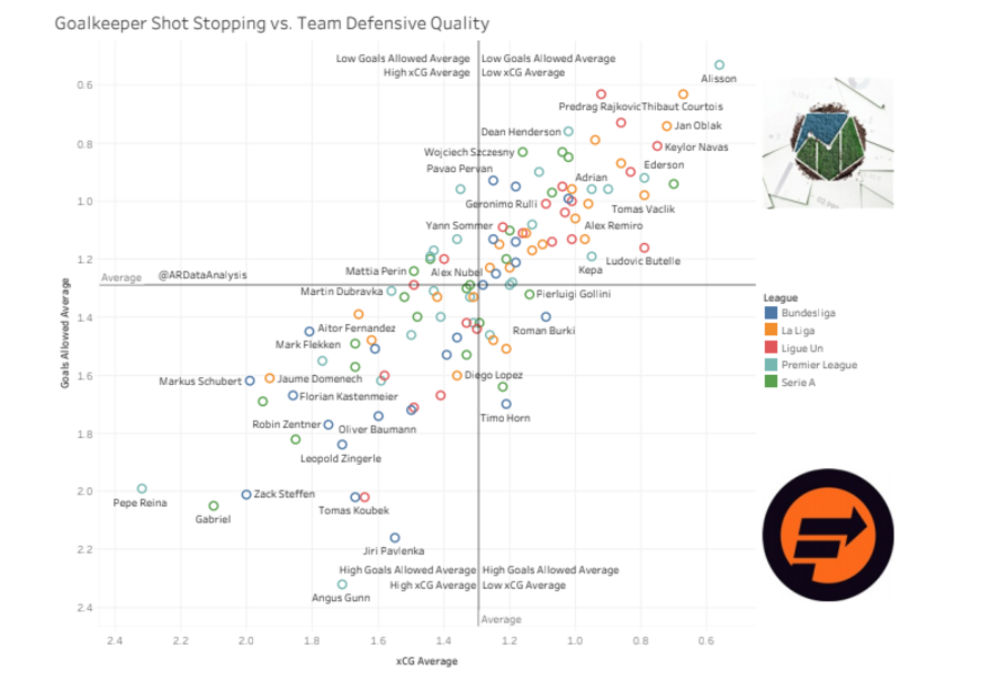 In the graph above, we compare a goalkeeper’s conceded goals average vs. xCG to compare how the goalkeepers in our database perform in relation to how you would expect the goalkeeper to perform thanks to the chances allowed by the defending in front of them.