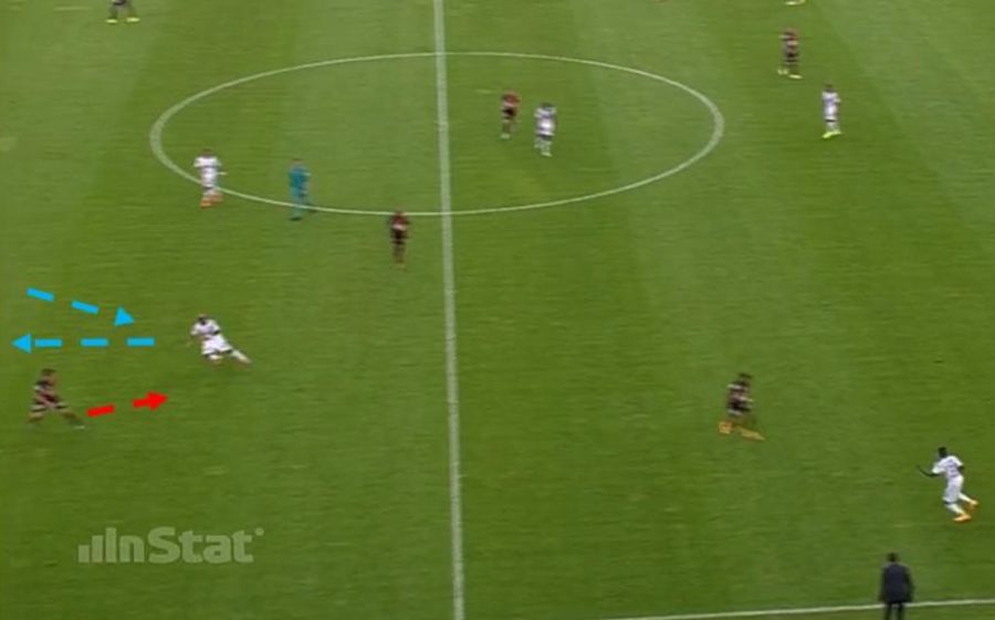 This movement is made very often during the final stage of an attack and this generates a positional advantage because the winger, thanks to his position (facing the goal), he has a clear advantage over the defender, who has his back to the goal.