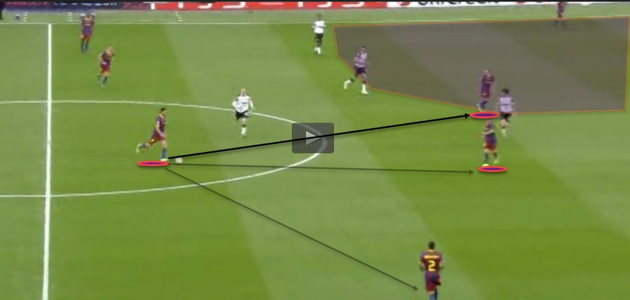 We see this here as Barcelona look to progress the ball forward. The first pass goes to the feet of Villa as he moves back towards the ball. This movement has dragged the United defender, Nemanja Vidic, towards the ball. Villa simply sets the ball back at a slightly different angle and as Iniesta moves across we see Alves moving quickly to a high position. Iniesta is then able to play a simple through ball to find this run.