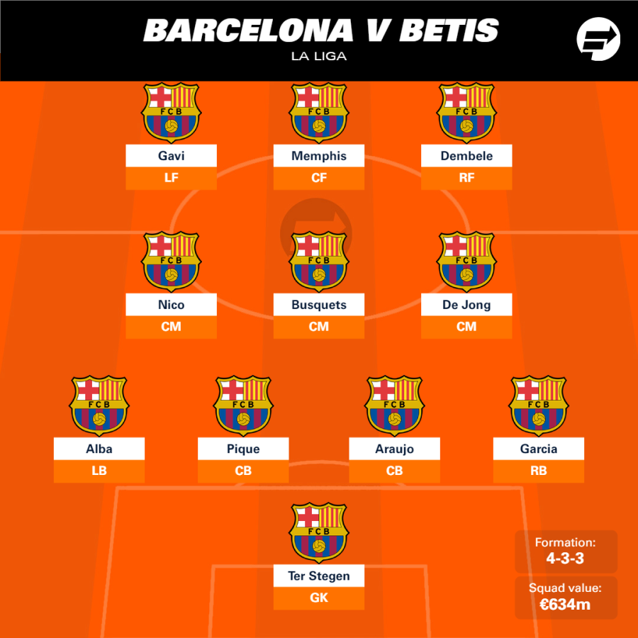 Marc-Andre ter Stegen will start in goal behind a probably back four of Eric Garcia, Gerard Pique, Ronald Araujo and Jordi Alba.