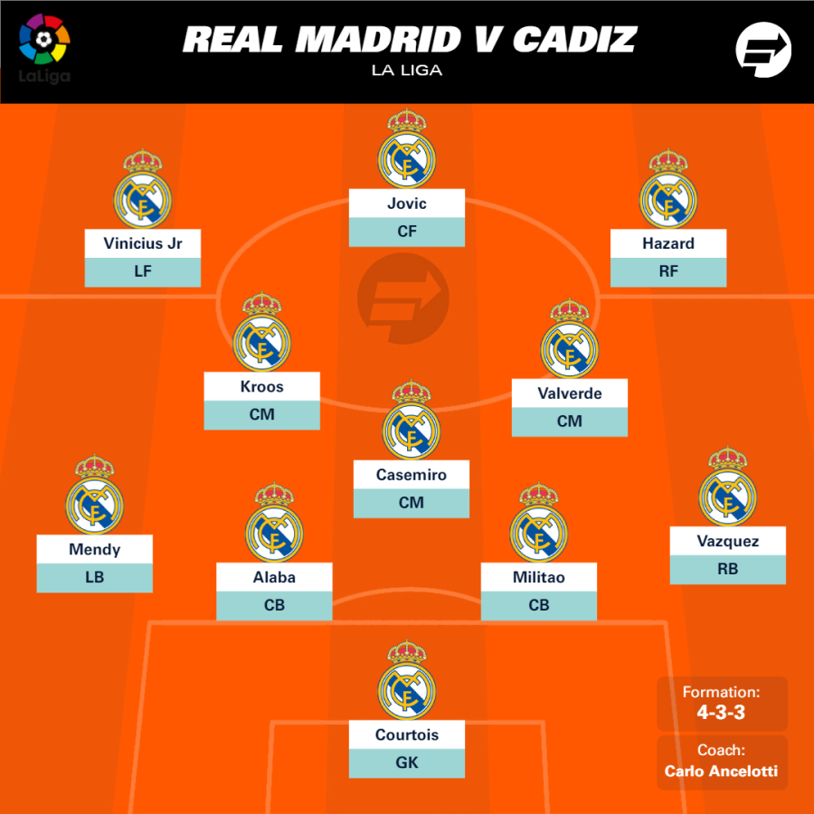 Thibaut Courtois will start in goal as always, with Vazquez, Eder Militao, David Alaba and Ferland Mendy set to make up the back four, with Nacho also an option at right-back.