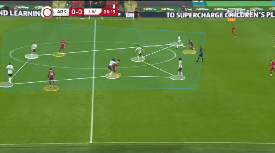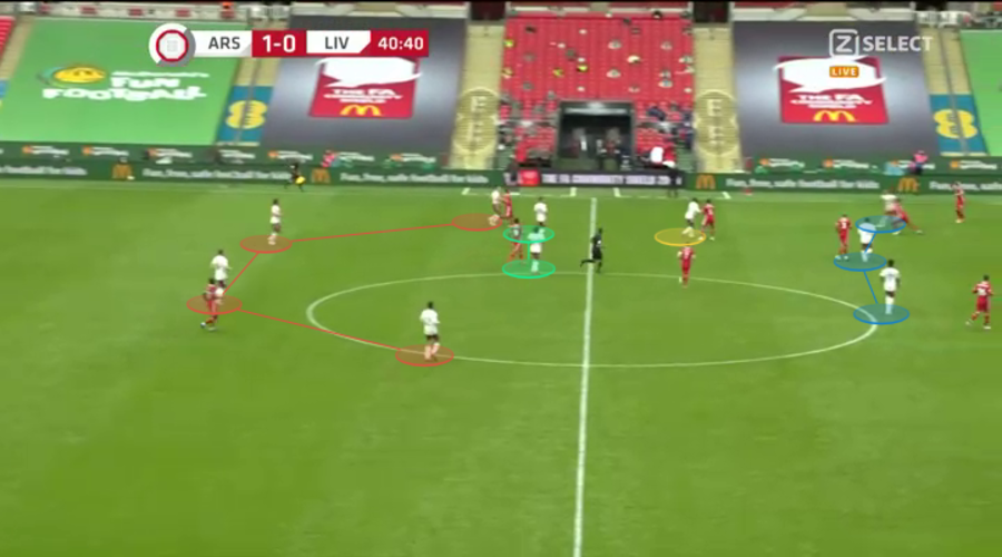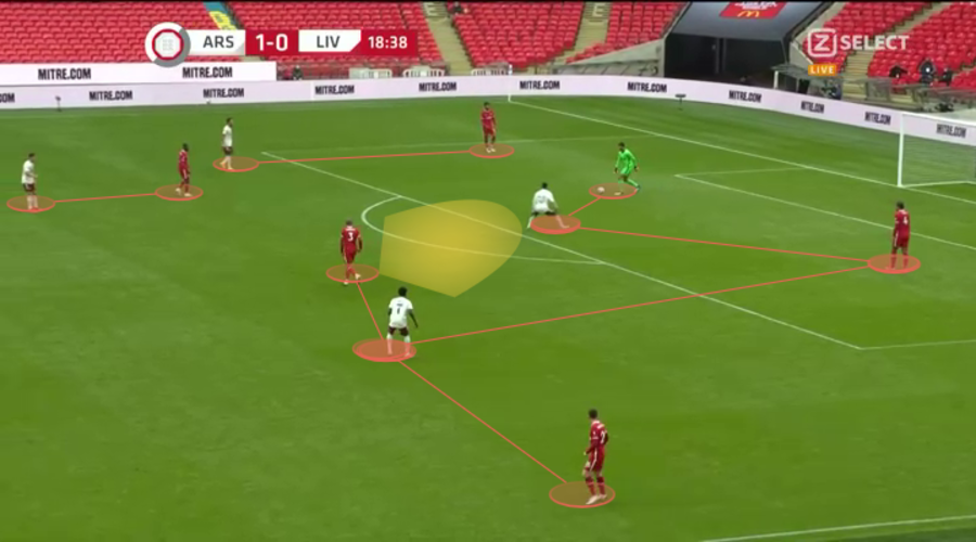 Due to Liverpool having numerical superiority when passing out from the back, how Arsenal's line of Pierre-Emerick Aubameyang, Eddie Nketiah and Bukayo Saka performed dual roles of both pressing their man and curving their runs to block passing lanes to Fabinho, the full-backs or return balls back to a central defender, was instrumental.