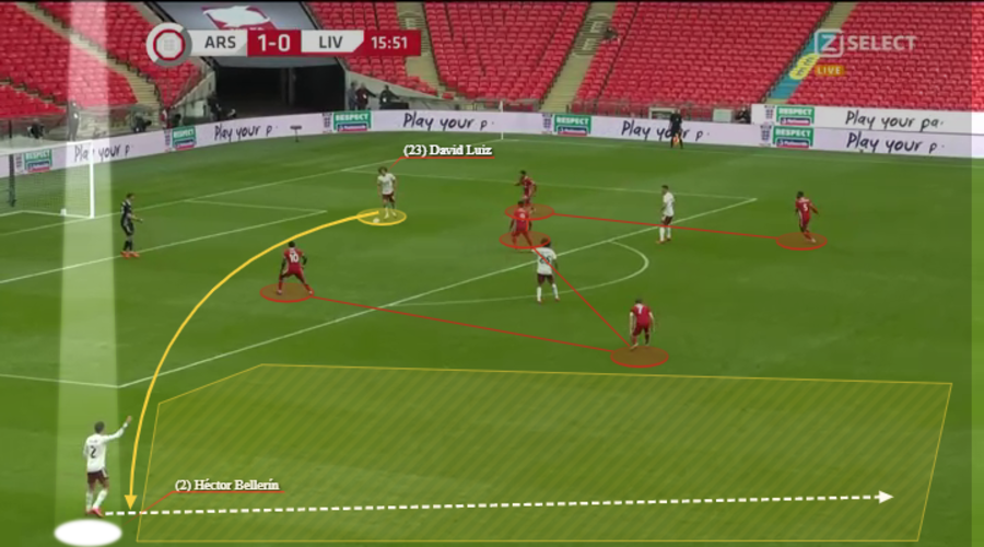 Persistently asking questions of Liverpool and manipulating their defensive shape, Arsenal's beautifully crafted goal served as a testament to their success in this area. Here, after attracting Mane, Firmino and Milner out centrally, Rob Holding found Bellerin free behind Liverpool's pressure.