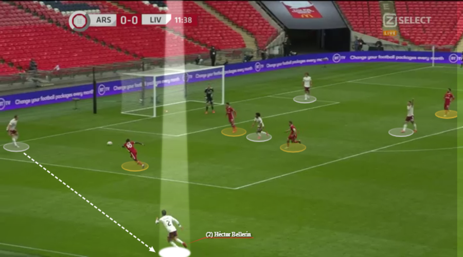 Altering their shape in possession to more of a 4-2-1-3/4-2-4, this posed issues for Liverpool, with the key features being how Ainsley Maitland-Niles ventured into an attacking midfield station and that Kieran Tierney pushed wide to operate at left-back.