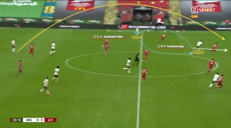 Another method Arsenal used to get at Liverpool was via Aubameyang and Maitland-Niles' excellent dovetailing. Switching positions and rotating neatly, this frequently caused dilemmas for Neco Williams on who to mark. Whether using opposite movements, decoy runs, nifty positional swaps and by pinning their marker, Arsenal were able to exploit the channels or generate openings infield. As a result of Maitland-Miles being so comfortable playing in central midfield, his intelligent positioning not only let him receive between the lines but also drew out Williams to free up Aubameyang down the flank.