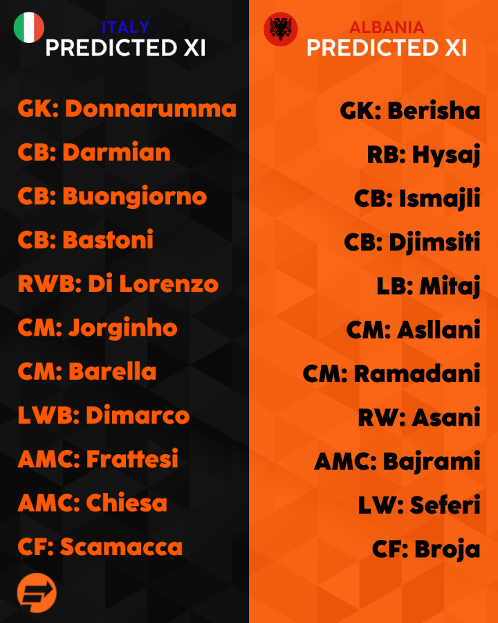 Italy (3-4-2-1): Donnarumma; Darmian, Buongiorno, Bastoni; Di Lorenzo, Jorginho, Barella, Dimarco; Frattesi, Chiesa; Scamacca