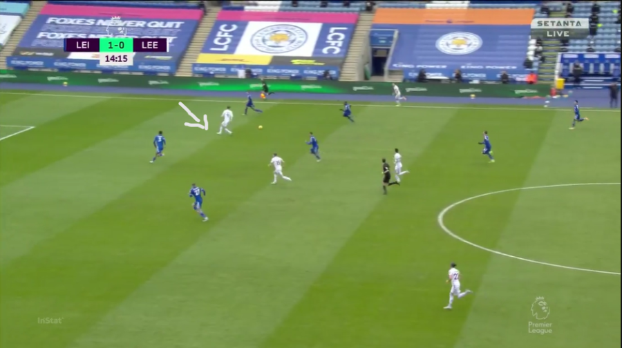 In the next instance, Bamford peels off his marker and intelligently drops between the defensive and midfield lines, offering his services to an onrushing Jack Harrison.