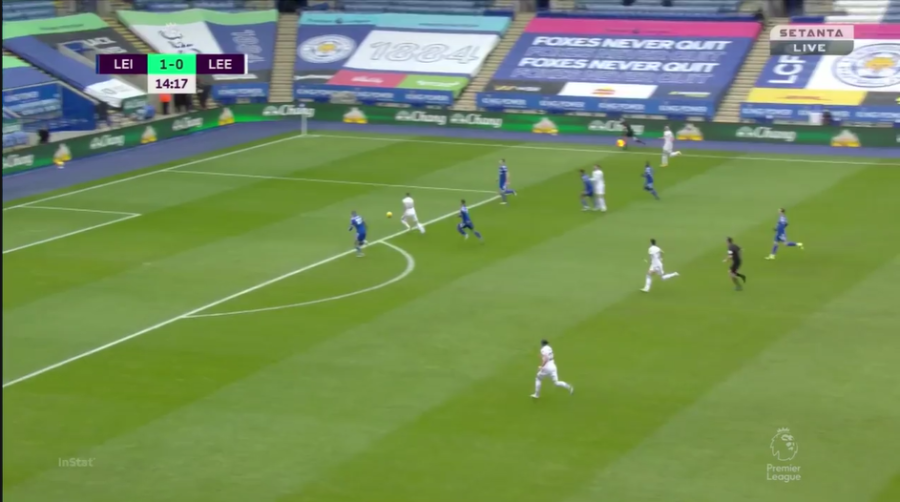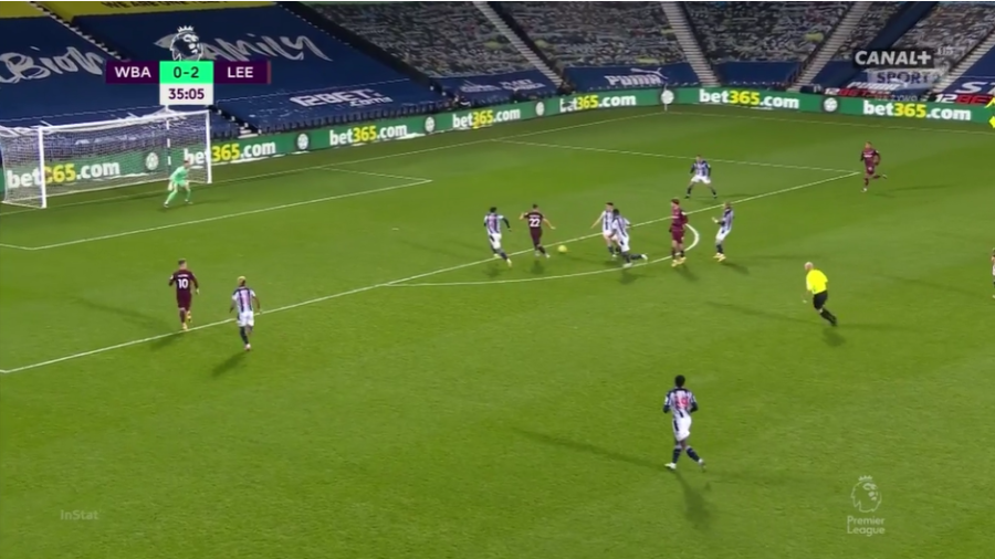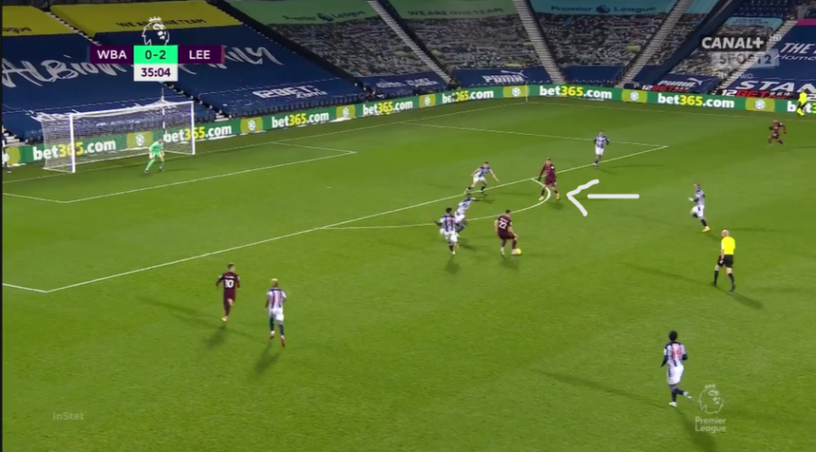 There are several benefits to this, although the two most obvious advantages are what Leeds profit from the most. Midfielders and wingers will often arrive late in a move, filling the void that Bamford has created in the centre of the attacking third, either looking for a slipped through ball or playing a wall pass and latching onto a quick one-two in order to get in on goal. That is exactly what happens below.