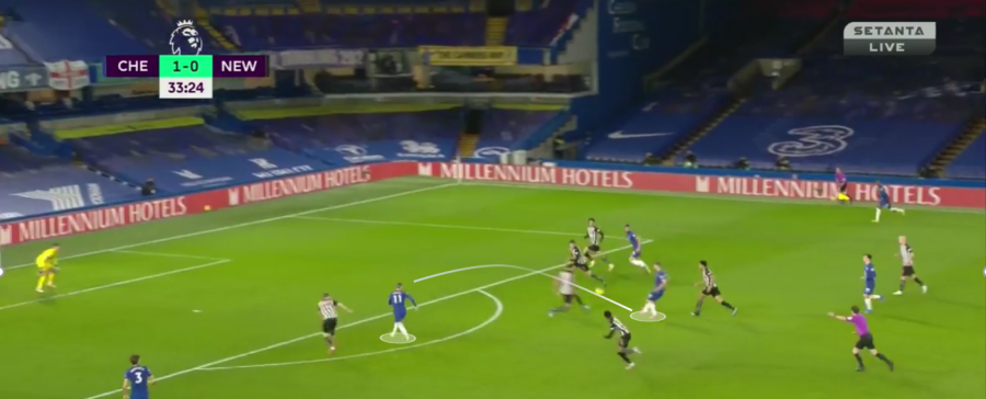 In the above image, the Chelsea man receives the ball 10 yards inside his own half, shimmies past Newcastle loanee Joe Willock and lofts a perfectly weighted pass into the feet of Abraham. The England international finds himself in on goal, and only a last-ditch tackle from Jamaal Lascelles prevents a shot at Karl Darlow's net. An almost identical situation occurred the week before at Bramall Lane, only this time it was Werner on the receiving end.