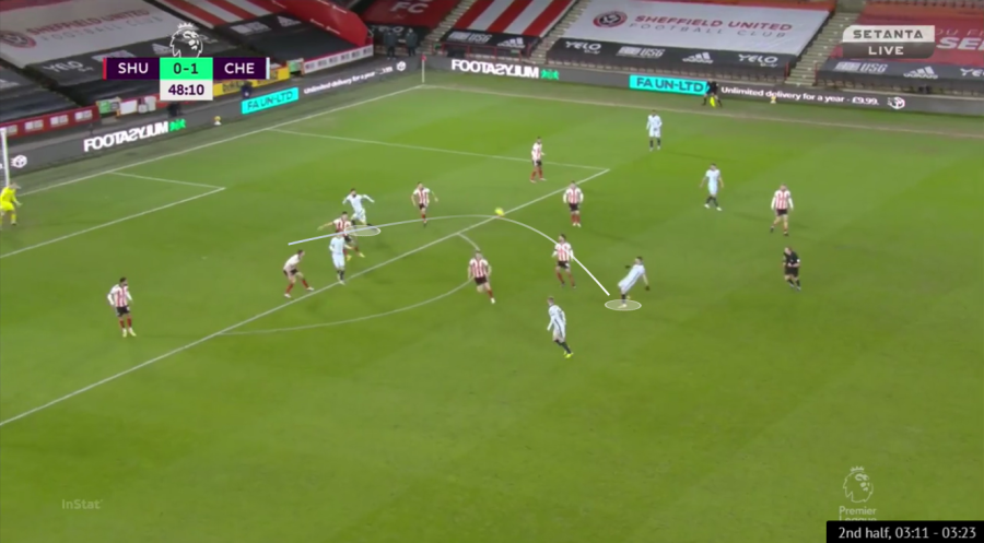 In the next instance, the Chelsea man receives a pass with a well-organised Sheffield United low block ahead of him. Kovacic takes a touch before showing his creative instincts and scoops the ball over the Blades' midfield and defence for Giroud.