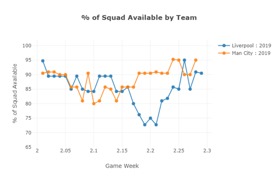 - Liverpool's incredible form this season and inevitable title win is all the more remarkable considering the relative injury crisis they suffered in mid-season which pushed their squad availability down to nearly 70%
