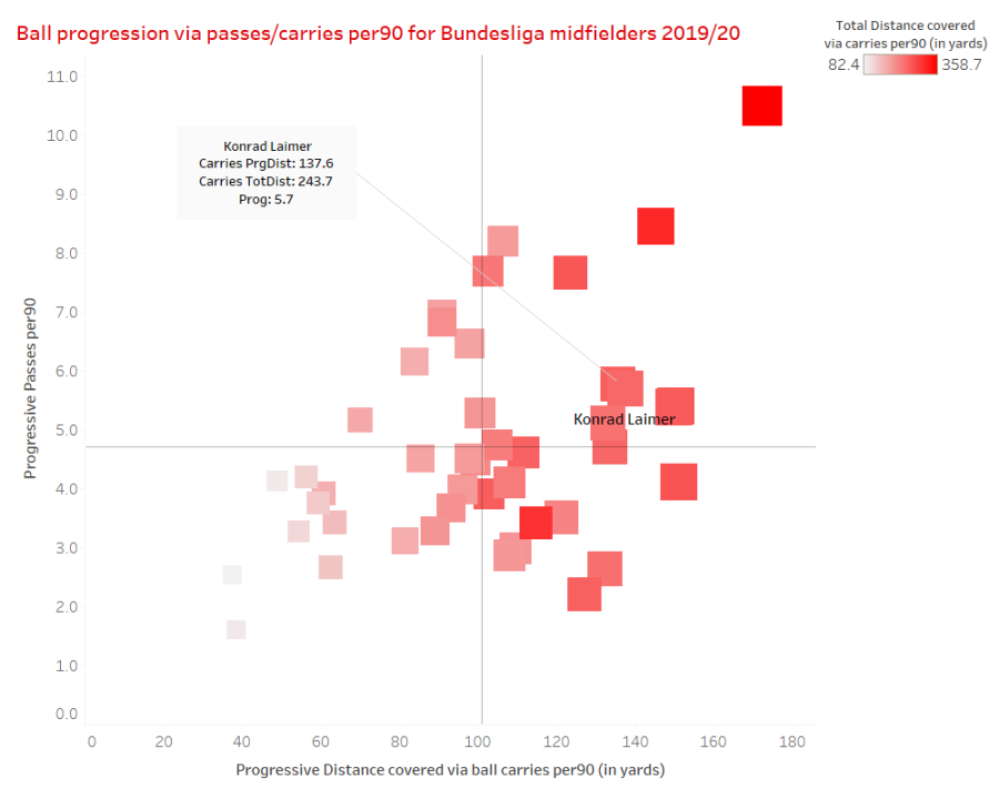In the above scatterplot, there are four regions divided as per the metrics, and Laimer is in the second quadrant. What it means is that he is significantly better than the average Bundesliga midfielder at progressive passing as well as ball carrying. Making 5.7 progressive passes last season and covering a progressive distance of 137 yards towards the opponent’s goal per game.