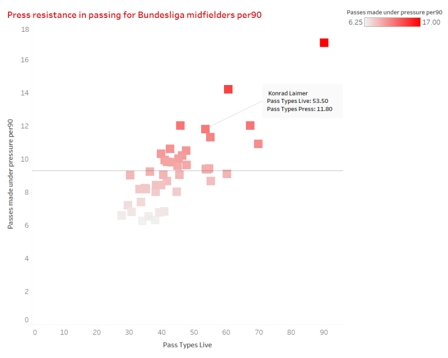 Laimer completed almost 12 passes under pressure per match in the Bundesliga, which is significantly better than the average Bundesliga midfielder, as the graph shows. He is just as good as evading the press as he is at pressing itself.