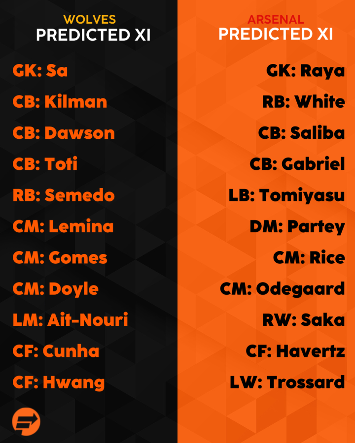Wolves (3-5-2): Sa; Kilman, Dawson, Toti; Semedo, Lemina, Gomes, Doyle, Ait-Nouri; Cunha, Hwang.
