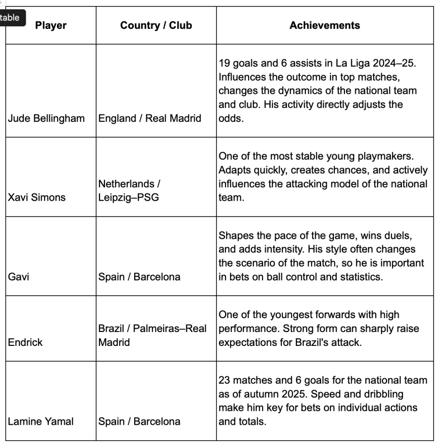 The closer the 2026 World Cup gets, the more interest in young footballers grows. They appear in starting lineups, decide key moments, and immediately catch the attention of commentators and analysts. This is immediately felt in the betting market: odds move faster, and demand for individual bets increases after each impressive performance.