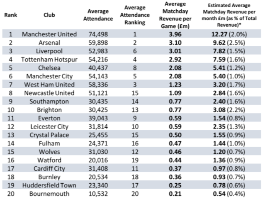 These numbers are calculated by taking the average matchday revenue each team receives, divided by the number of home games they hosted during the 2018/19 season.